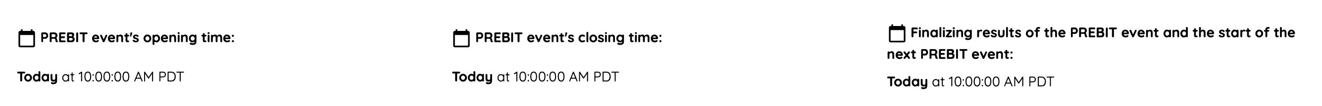 A Prebit event is hosted on our platform with a clear opening and closing time. \